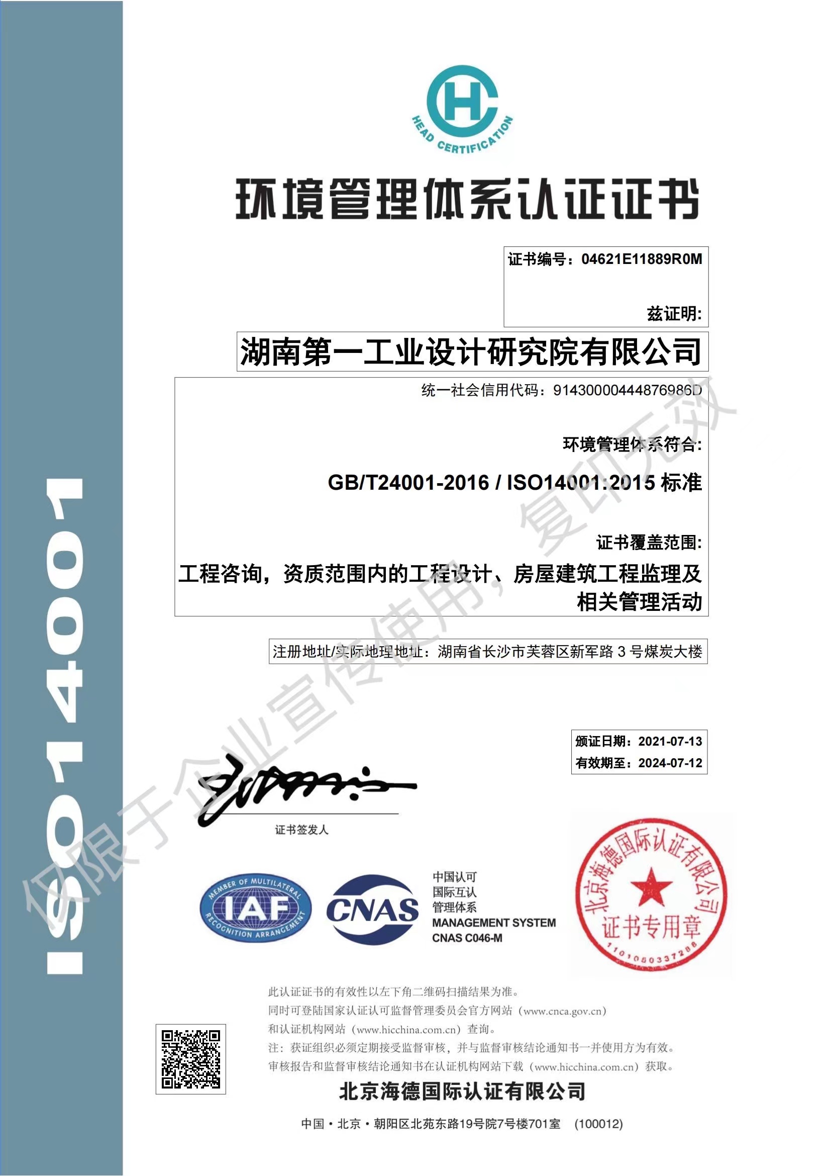 ISO14001環(huán)境管理體系認(rèn)證證書(shū)